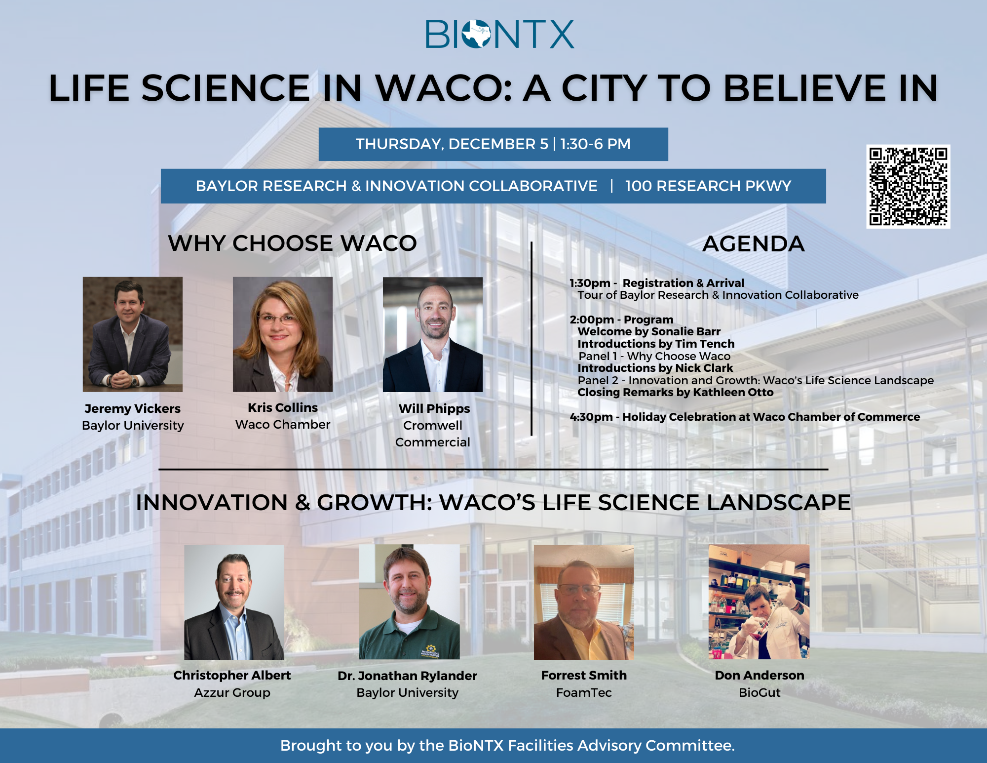 Join BioNTX at the Baylor Research and Innovation Collaborative (BRIC) as we spotlight the rapid growth of Waco's life science industry. This exciting event will feature two dynamic panels—Why Choose Waco, where city and chamber officials will discuss Waco's appeal as a business hub, and Innovation and Growth: Waco's Life Science Landscape, highlighting local life science and medical innovation businesses driving change.