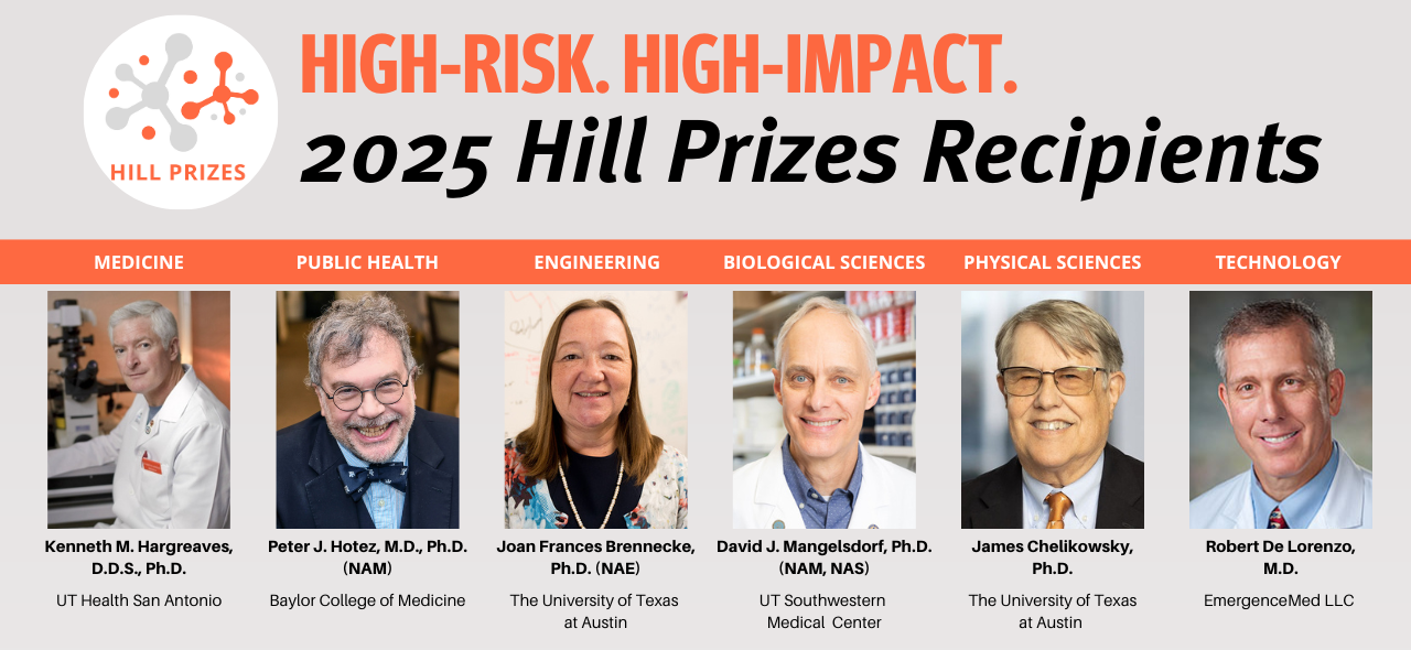 TAMEST and Lyda Hill Philanthropies have revealed the 2025 Hill Prize winners, honoring groundbreaking Texas innovators in Medicine, Public Health, Engineering, Biological Sciences, Physical Sciences, and Technology. This year marks the first inclusion of a Public Health category and expanded support for highly ranked applicants, reinforcing Texas’ reputation as a leader in world-class research and innovation.
