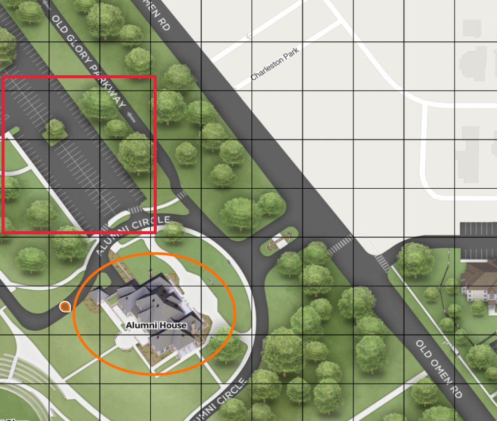 Complimentary parking is available in the area marked by the red box in the image.